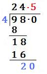 | 18 ÷ 4 = 4 | 4 × 4 = 16 | 18 − 16 = 2 | 2 ÷ 4 = number less than one so bring down the number 0 from 98.0: |